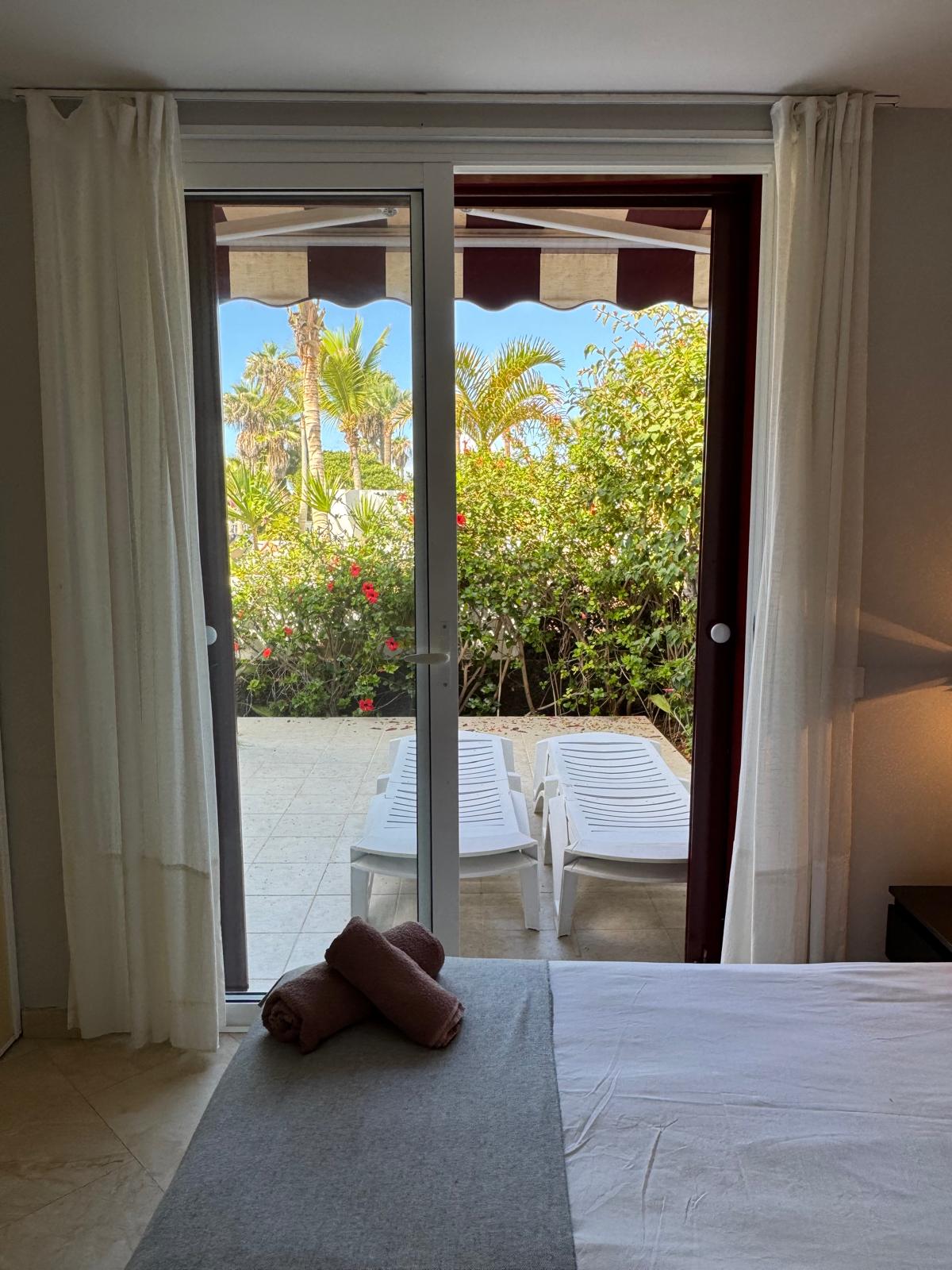 Desde la terraza se aprecian agradables vistas a las zonas verdes y a la piscina principal, creando un entorno tranquilo y acogedor ideal tanto para vivir como para invertir.