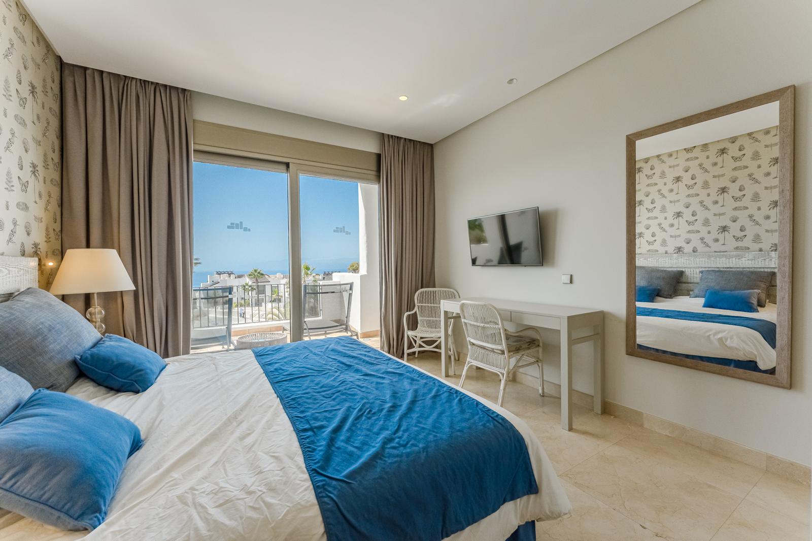 Los dos dormitorios y dos baños han sido diseñados con un estilo elegante y atemporal que ofrece un ambiente de bienestar y sofisticación. El gran atractivo de la propiedad es su amplia terraza, desde la cual se disfruta de una vista panorámica espectacular al Océano Atlántico, a la isla de La Gomera y al campo de golf de 18 hoyos, considerado uno de los mejores del sur de Tenerife.