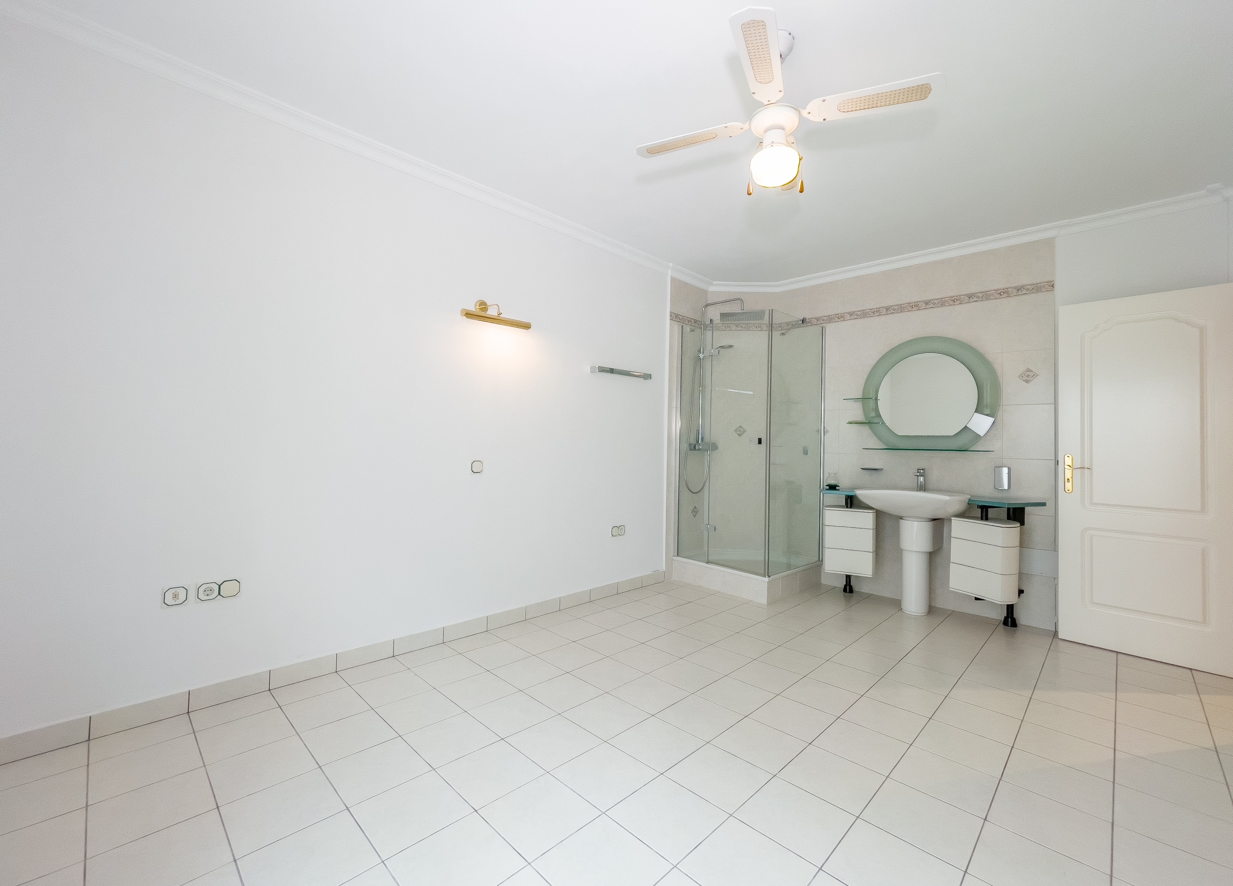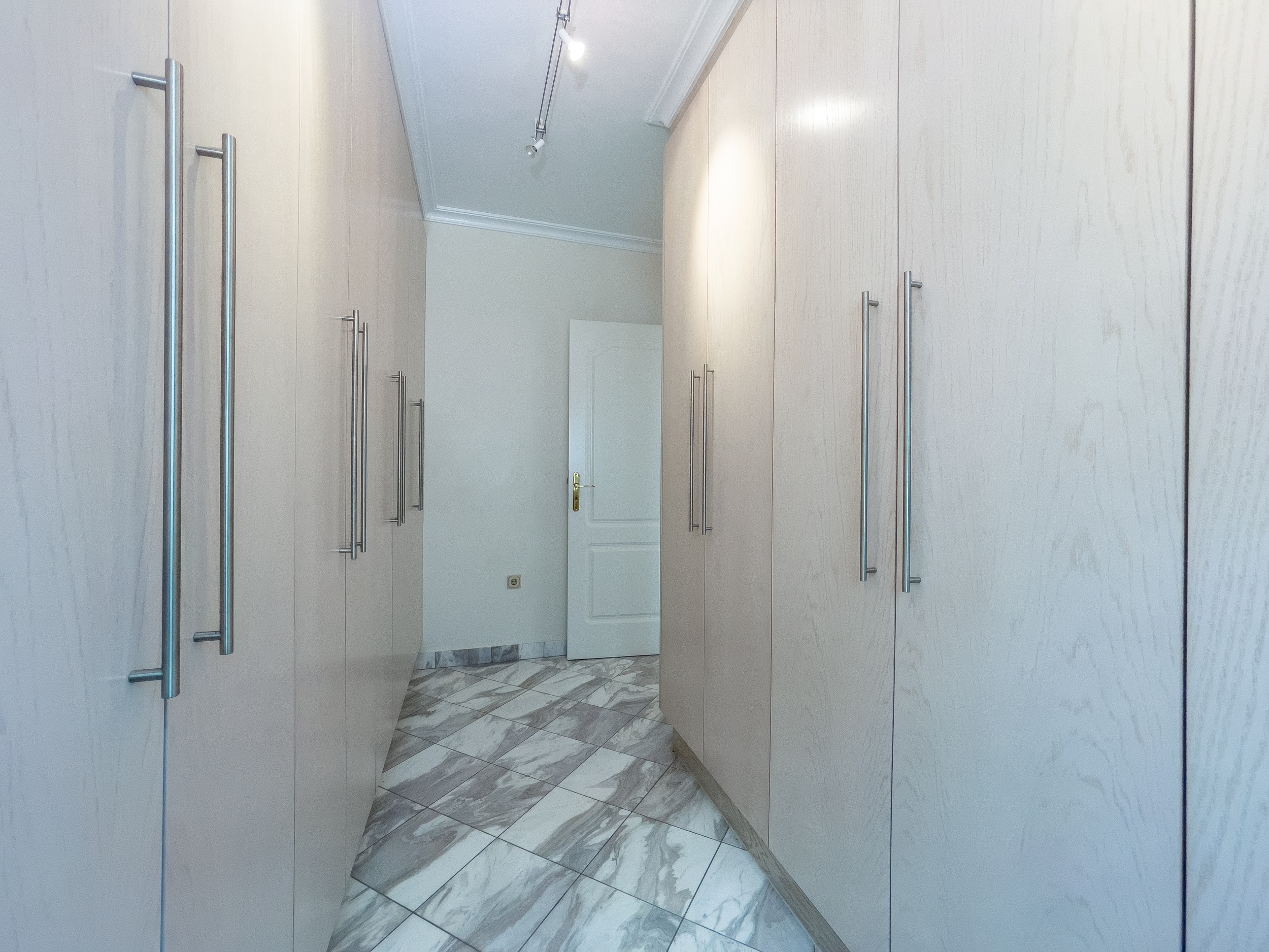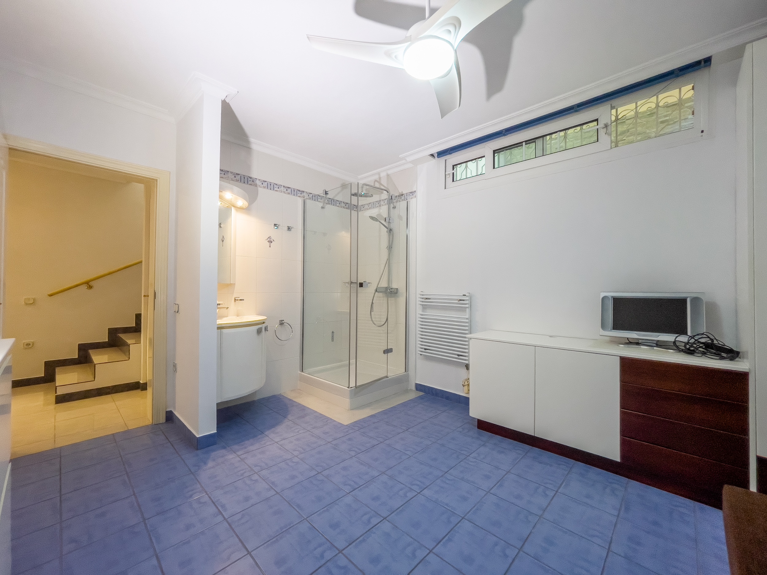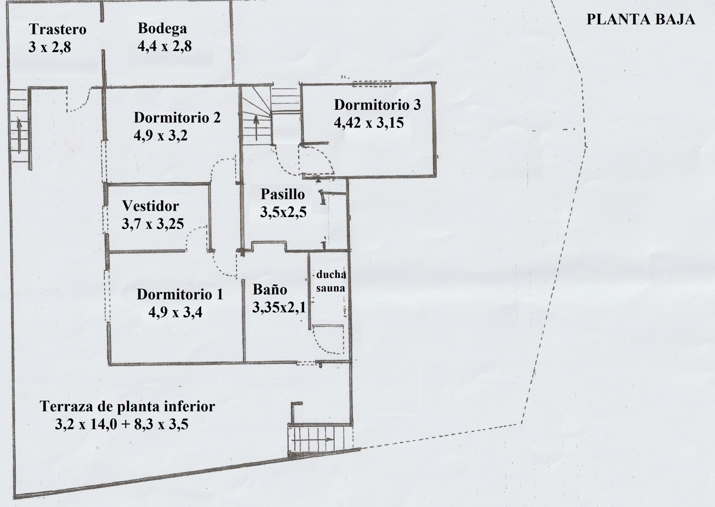 En la planta baja hay un pasillo con armario empotrado, aseo y tres dormitorios, dos de los cuales tienen acceso a la terraza inferior y otro es una suite con vestidor propio y baño con ducha y sauna hammam. También hay un amplio garaje con armarios y un lavadero, además de una bodega refrigerada.