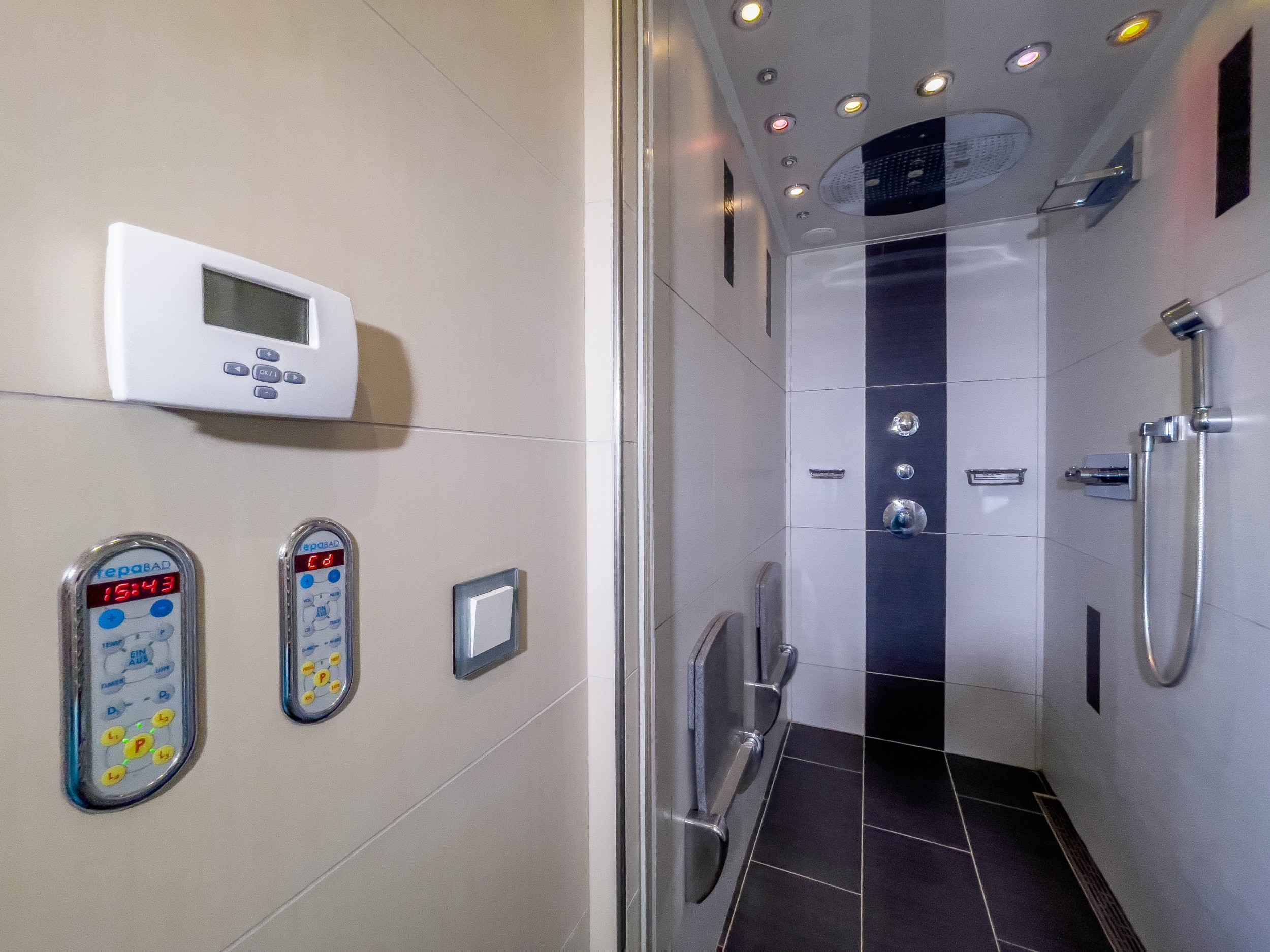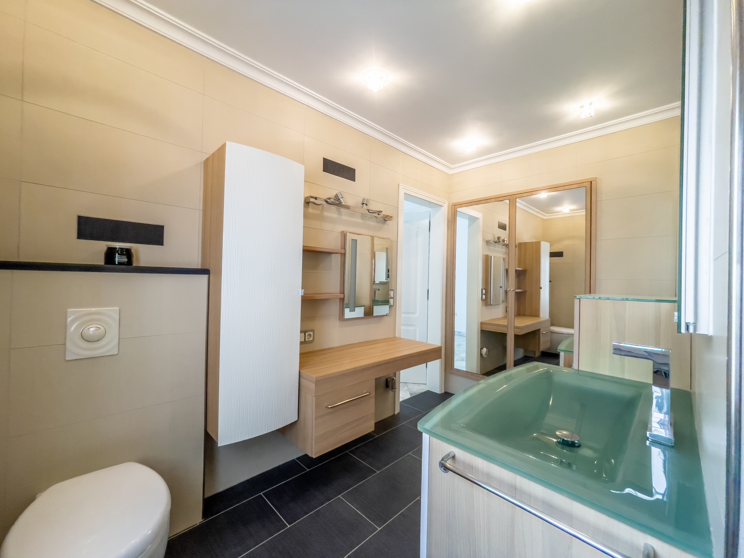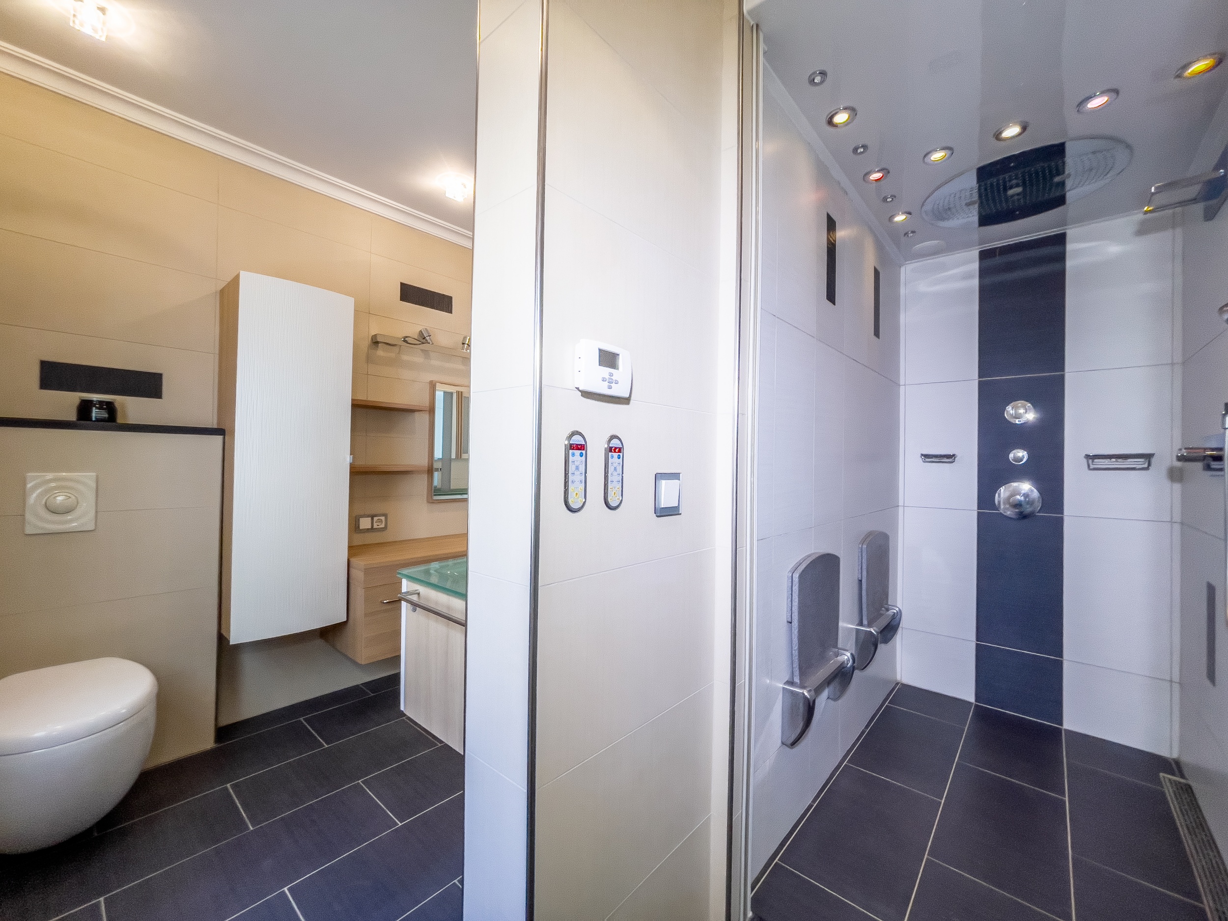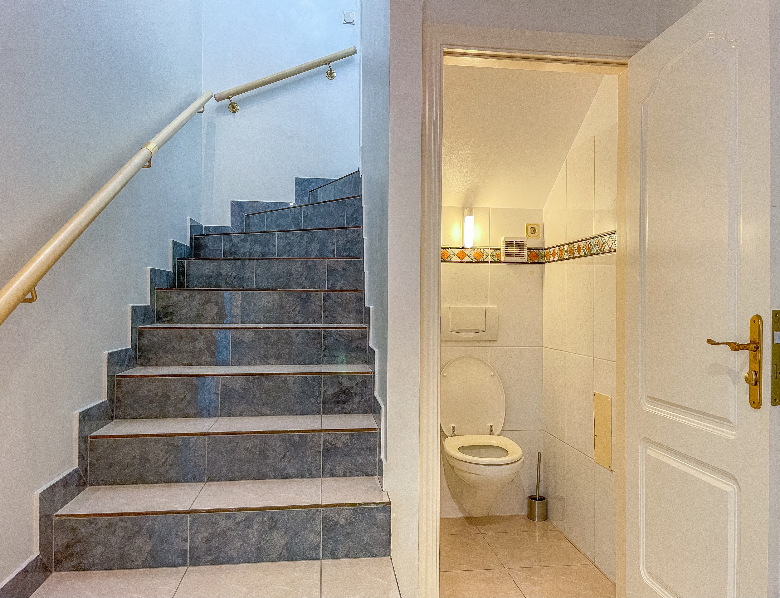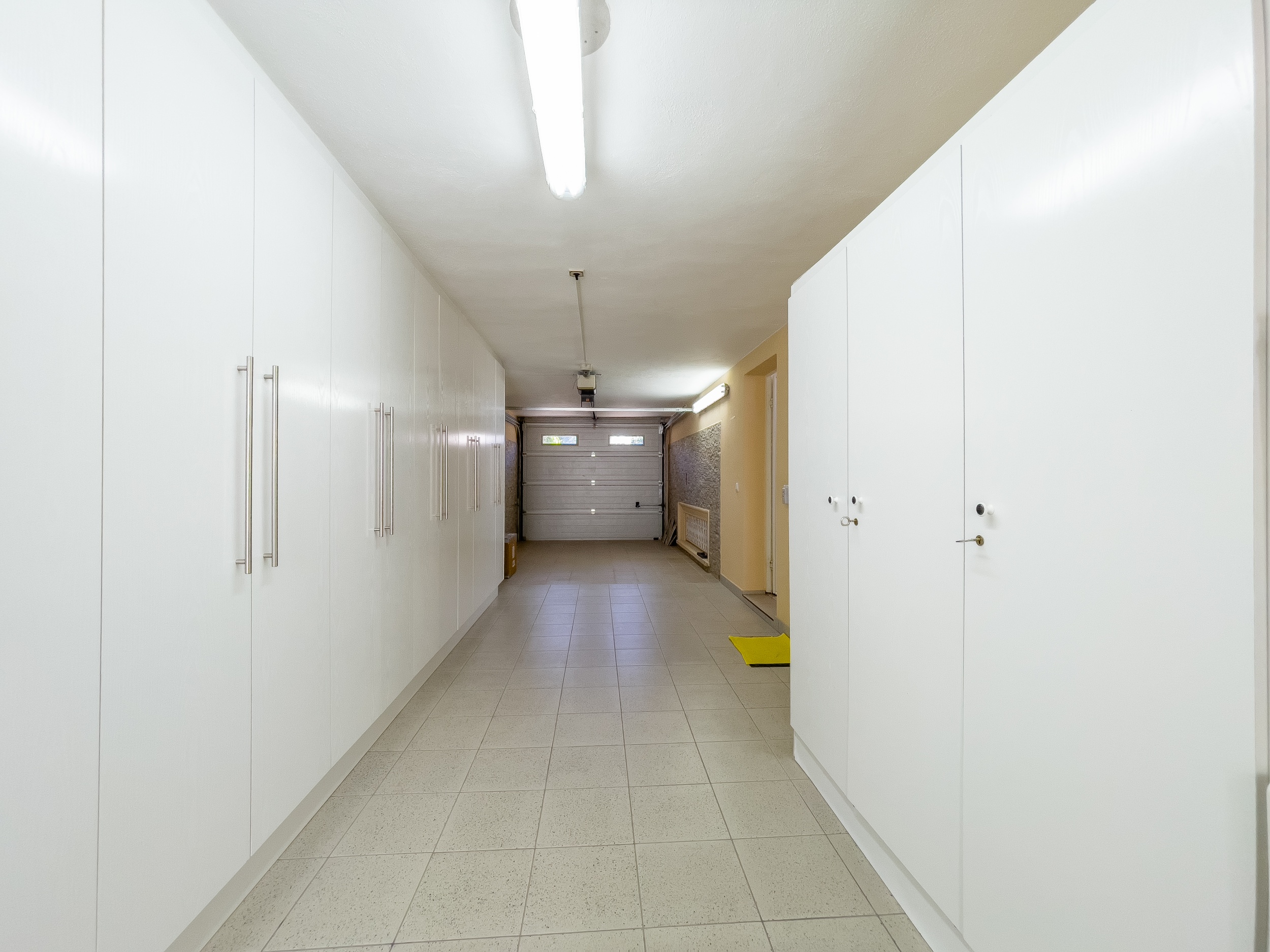 En la planta baja hay un pasillo con armario empotrado, aseo y tres dormitorios, dos de los cuales tienen acceso a la terraza inferior y otro es una suite con vestidor propio y baño con ducha y sauna hammam. También hay un amplio garaje con armarios y un lavadero, además de una bodega refrigerada.